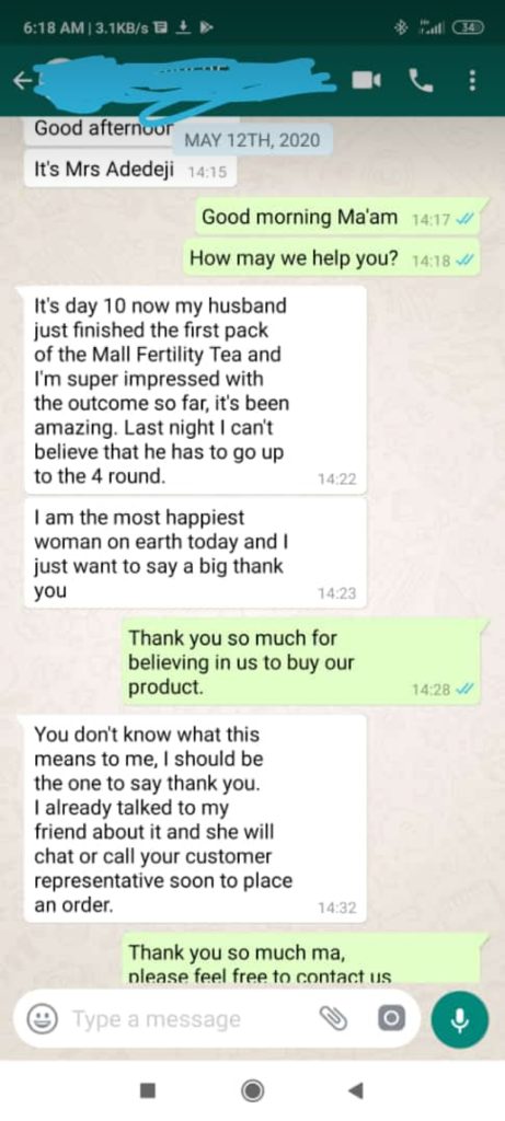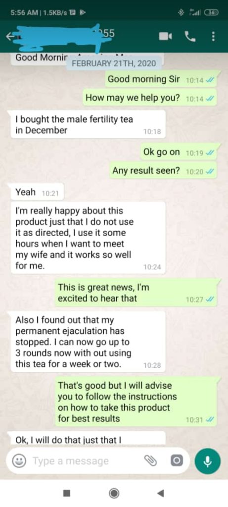“I’m almost speechless! The results I received from using this Male Fertility Solution Tea are better than I ever imagined. I had difficulty experiencing erection before I tried your product. Now I’m having the most amazing sex I’ve ever had in my life. I’m knocking the socks of my wife every time we make love. I can’t believe it and she can’t believe it either! Thank you!” MR ADESANYA, ILARO, OGUN STATE